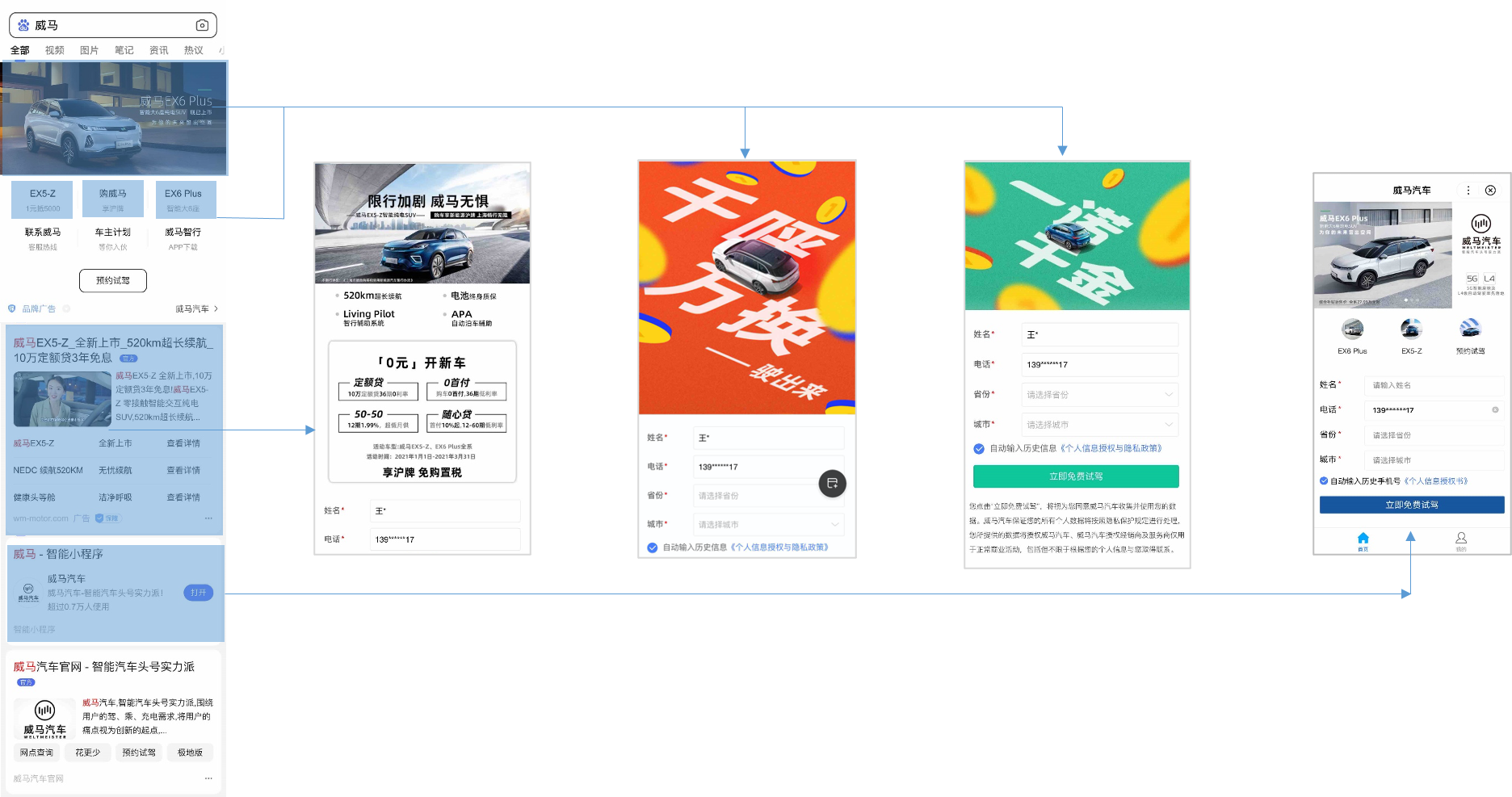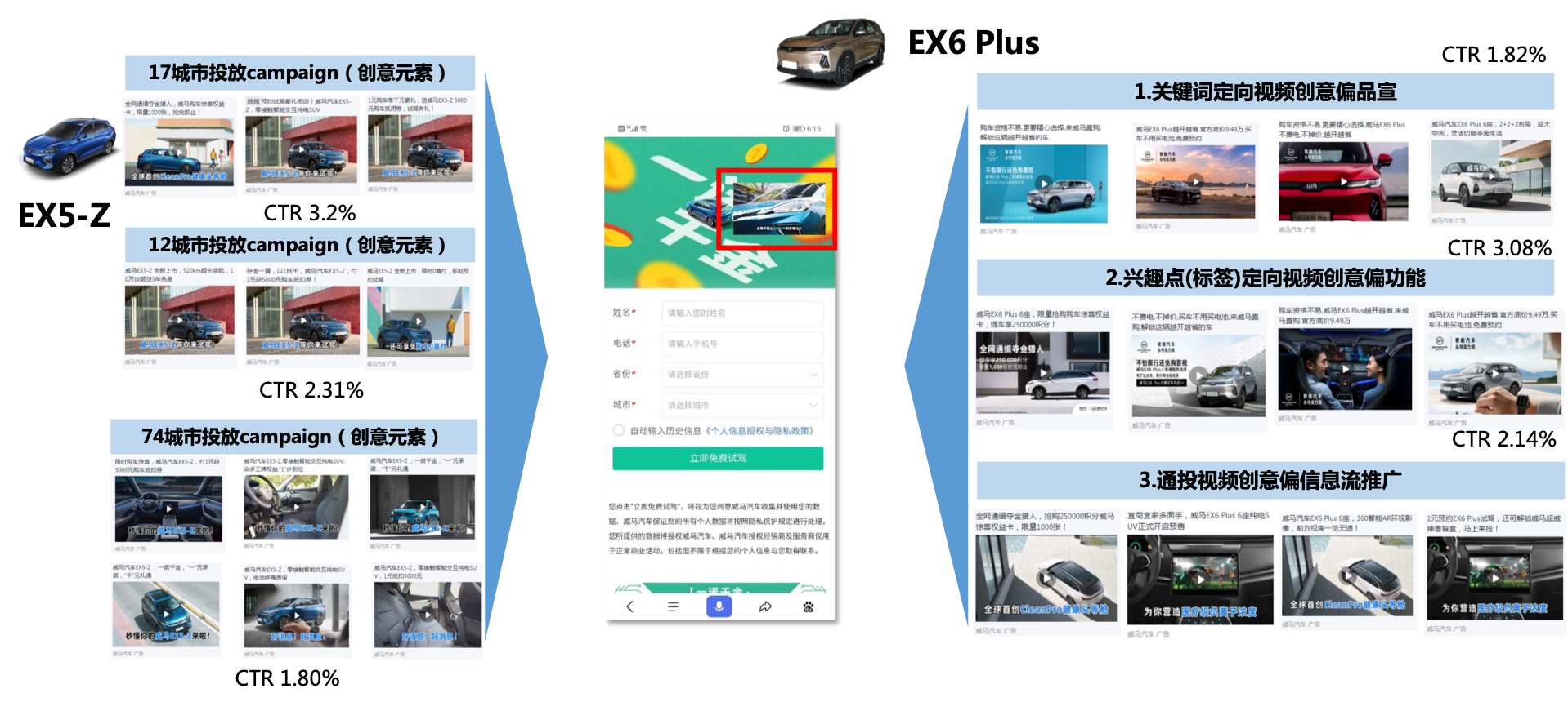 威马EX5-Z以活动维度为主题投放创意,而EX6 Plus根据定向人群的不同,区分创意内容形式; 威马的视频信息流+基木鱼+oCPM/oCPC同样有较好的效果表现,在拉量的同时维持了较好的转化效果,搜索推广转化线索成本降低85%,且信息流推广优于关键词!同时威马汽车落地页的点击广告后成功跳转到落地页面的比例 >95%,转化率>0.25% ,均高于行业平均基准!